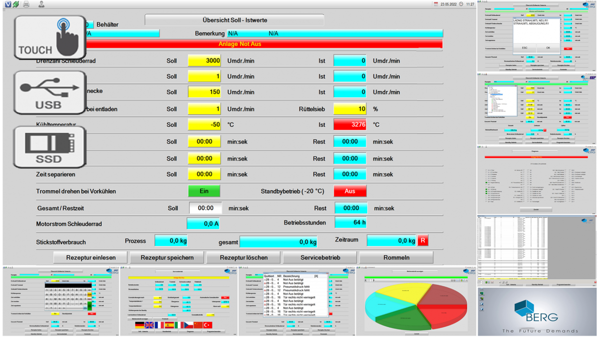 Commande écran tactile 21″ Full HD pour la gestion du déroulement des travaux optimale, avec des nombreuses possibilités comme par example gestion de recettes (aussi code-barre), restriction d’opérateur & demande de mot de passe, mode standby, cryo-traitement LN2-eco ou conforme à l’assurance qualité sélectionnable, indicateur de consommation de l’azote liquide, enregistrement, documentation & traçabilité de tous les événements et utilisateurs (fichier CSV), système de notification, service mode manuel et bien plus encore